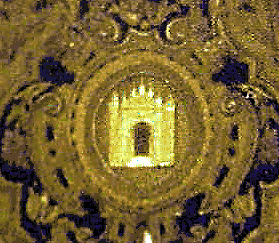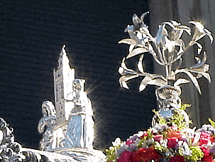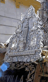 Sevilla 15 de Mayo 2001 Como deciamos el dia anterior Sevilla cuando se va al Rocio tambien se quiere llevar un pedazo de ella, para entre las nubes del polvo bajo un Sol de justicia, a la luz de las candelas en las noches de relentes, poder mirar un trozo de su tierra, representada en sus monumentos .- Aqui vemos en la parte trasera de la Carreta del Simpecao de la Hermandad de Triana en plata inconmensurable obra de Emilio Garcia Armenta 1952-1954 a la Inmaculada con clara inspiracion en el monumento a la Inmaculada de la plaza del Triunfo .- |