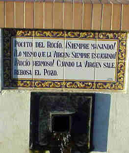 El hoy y el ayer del pocito frente a la ermita del Rocio EL POCITO Como se puede apreciar en la imagen de la derecha de primeros del siglo XX, habia un pocito de agua que no era meramente decorativo sino que abastecia a peregrinos y devotos que alli se congregaban dada la la lógica falta de instalacion de agua corriente y la unica gua potable era a base de pozos .Fijete en el detalle de la indumentaria de los romeros, los bucaros, las cantaras y al fondo la vieja ermita .- Hoy ese pozo existe frente a la ermita no solo de una forma testimonial sino que incluso brota de él agua , y sobre su caño los poemas de un canto que en su dia fuera muy popular entre los rocieros : Pocito del Rocio