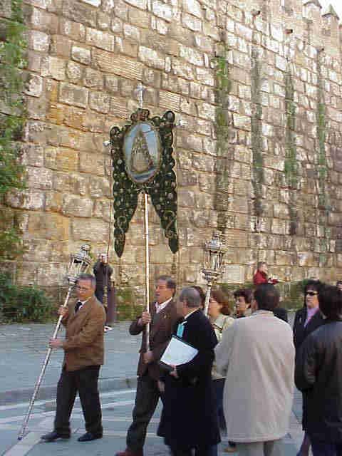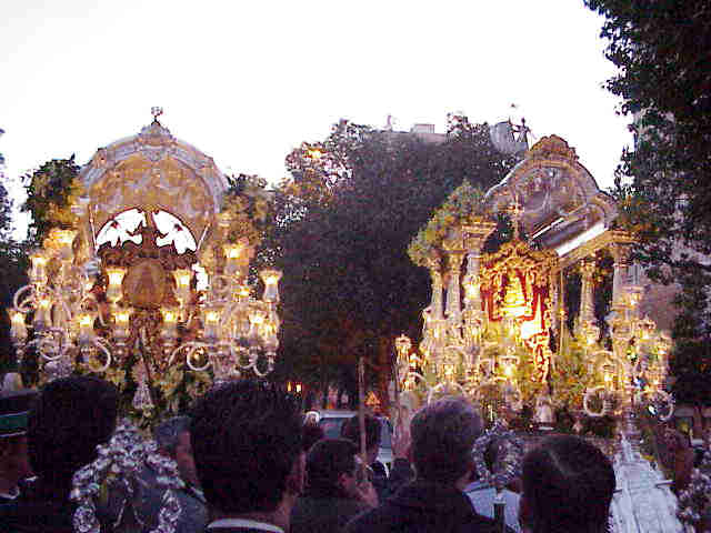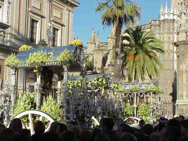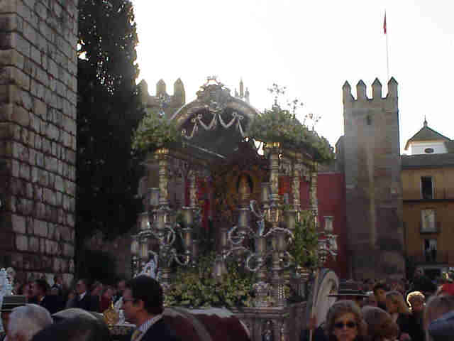 HERMANDAD DEL ROCIO DE ALMONTE EN SEVILLA AL FONDO LAS MURALLAS DEL ALCAZAR |