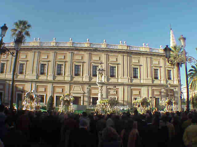 LAS CINCO CARRETAS DE LAS HERMANDADES DE SEVILLA JUNTAS MACARENA, SEVILLA SUR, EL CERRO ,SEVILLA Y TRIANA AL FONDO LA ESPALDA DEL ARCHIVO DE INDIA |