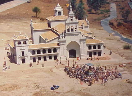 Sevilla 27 de Abril 2002 No, no se engañe en la imagen no ve una fotografia aerea de un instante de la procesión de la Virgen del Rocio, pero podria serlo .- Durante al Exposición Universal del 92 hubo un espacio dedicado a la Andalucia de los niños, junto al Puente de la Barqueta que se podia visitar bien andando o bien en un pequeño tren y era un recorrido por los principales monumento o eventos de las ocho provincias andaluzas.- En la zona dedicada a Huelva logicamente no podia faltar ni la ermita del Rocio , ni el momento cumbre de la procesión de la Blanca Paloma. Si se detiene observará que no falta un perejil, peregrinos, mujeres con batas rocieras, caballistas con sus grupas, hasta un despistado todoterreno . Asi como la ermita con todo lujos de detalles, si se fijan es curioso porque falta el balcon de la esquina que se construyó en honor a Su Santidad el Papa Juan Pablo II, ya que fue al Rocio despues de la Expo del 92 , concretamente a las siete de la tarde del 14 de junio de un año despues .- Por primeras vez se puedieron ver encuadres de una Andalucia decimononica de carretas, bueyes y caballista con la Andalucia que empezaba a asomarse al siglo XXI teniendo como telón fondo los flamantes emblemáticos y futuristas puentes de una Exposicion Universal del 92 que estaba en todo su esplendor , de luces multicolores y banderas al viento .- No obstante en el mágico 1992 tampoco falto
