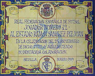 Sevilla 27 de Mayo 2002 En estos dias que estamos enchidos de fevor patrio por mor del futbol ( es increible que seamos capaces de unirnos patrioticamnete por un balón de reglamento y no por cosas realmente graves que nos afectan a todos ), y que parece que pinta oros para nuestra selección española ( es curioso que aqui nadie diga eso de castellana o peninsular o del estado central ) de futbol , creo que es justo traer aqui un azulejo, ustedes saben que un servidor es el tonto del azulejo, que no esta en ninguna recoleta iglesia, convento o callejón perdido de nuestra Sevilla, sino que esta en el Estado Ramon Sanchez Pijuan sede ( por ahora ) del Sevilla F,C. .- La selección española de futbol nunca ha perdido en dicho estadio, al igual que la seleccion inglesa tiene el estadio de Wembley , la francesa el Parque de los Principes o la brasileña Maracana nuestra selección su estadio talisman, pese a quien de pese en es el Estadio Sanchez Pijuan ; curiosamente un estadio que ultimamente es noticia, por la obseción que hay con venderlo y mandar al Sevilla F.C al Estadio Ruina Olimpico de Santiponce .- La selección española juega por primera vez en el Sanchez Pijuan en 1961 en un partido amistoso con Argentina aunque su primer encuentro oficial se celebró con motivo de la Eurocopa de 1964 frente a la R de Irlanda .Amen de partidos amistosos todos los partidos trascendentes tanto de las Eurocopas como Mundiales la seleccion los ha jugado en el Estadio del Sevilla .- En 1988 concretamente el 12 de Ocubre la selección cumplió en este estadio su setenta y cinco aniversario en un encuentro amistoso entre España y Argentina . Un año después la Real Federación Española de Futbol hacia entrega de este azulejo conmemorativo del veinticinco aniversario del jugador num 12 , como era conocido el Estadio Ramon Sanchez Pijuan .- Para los amigos de la anécdota en Sevilla es donde mas goles ha metido un mismo jugador de nuestra selección a saber el mítico Emilio Butrageño que marcó siete goles visitiendo la camiseta nacional en el campo del Sevilla .- Sevilla, el Estadio Ramón Sanchez Pijuan