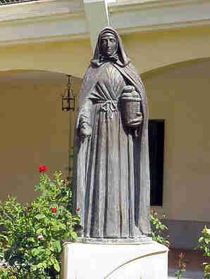 Sevilla 31 de Agosto de 2002 En estos dias las Hermanitas de los Pobres le estan dedicando una serie de misas a la que fuera su fundadora Sor Maria de la Cruz, o lo que es lo mismo Juana Jugan que alcanzaria la beatificación por una vida consagrada a los mas necesitados y menesterosos.- Esta escultura es el unico caso en Sevilla , de una monumento identico repetido; ya que uno se encuentra en los jardines de la Residencia de Ancianos de las Hermanitas de los Pobres de la calle Luis Montoto ( calle Oriente de toda la vida ) que corresponde a la imagen que aqui vemos y otra en Triana en la Residencia de Ancianos de Hermanas de la Consoloacion, antes Hermanitas de los Pobres .- En la base de su pedestal se puede leer BEATA JUANA JUGAN 1792-1879 , En 1979 se celebró el primer centario de su muerte por lo que se conmemoro con estas dos esculturas una para cada residencia obra del escultor Angel Acosta .- Como todos saben en La Sevilla que no vemos, se traen, esculturas , azulejo, monumentos, etc que se puedan admirar desde la calle, y este es el caso de esta escultura que gracias a la profunda remodelación que sufrio la residencia de anciano aun encontradose en los jardines, se puede ver desde la calle rodeada de flores , a traves de la verja de dicha benefica y señera institucion quie se encuentra muy vinculada con la vecina Hermandad de San Benito .- Como dato curioso comentare que la priora de cada