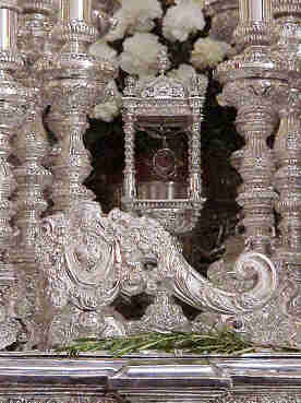 Cual no fue mi sorpresa al encontrar al Virgen del Carmen preparada para salir, lo que me me llevo una vez mas a recurrir al parroquiano mas cercano, que como el del Cerro me informó ampliamante . La Virgen del Carmen de Santa Ana , este año como ya anunciara en Sin Carmen de Santa Ana y Sin Pilatos en el 75 aniversario -16-VII-2002, no sale procesionalmente, sino saldra el próximo dia 26 de Julio , Festividad de Santa Ana a las 7 de la mañana en Rosario de la Aurora .. Parece que el epilogo carmelita lo pondrá esta bella imagen gloriosa , Glorias que como casi todos sabemos comenzaron en Marzo con la malquerida Virgen del Sol , ( concretamente el 16 de Marzo ) y que continuaran como siempre con la procesion de la Virgen de los Reyes , Patrona de Sevilla con papeles y que tambien es una hermandad de Gloria y cuya festividad no es el 15 de Agosto ( festividad de la Asuncion de la Virgen ) sino el 7 del mismo mes y continuara en Septiembre mas marinao que el mes de Mayo .- Quien quiera disfrutar de ver esta bellisima imagen carmelita por la calles de Triana , aunque no sea procesionalmente , sino en una devota tradición de un rosario ya sabe tiene que madrugar .- Quiien quiera ma sinformacion sobre la Virgen del carmen de Santa Ana : Ntra