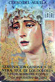 La reproducción gráfica del cartel y el acto de presentación han sido financiados por la Consejería de Trabajo de la Junta de Andalucía; y por la Junta Municipal del Distrito Este. MES DE SEPTIEMBRE Jueves 5 de septiembre.- Parroquia a las 21,30 h. Presentación del número especial dedicado a la Coronación Canónica de Nuestra Señora de los Dolores del Boletín de las Cofradías de Sevilla; acompañará el acto la Banda de cornetas y tambores de Nuestra Señora del Sol. Antes del comienzo de este acto, la Asociación de Mujeres Cofrades de Sevilla hará entrega a la Hermandad de un regalo con motivo de la coronación de la Santísima Virgen. Domingo 8 de septiembre.- Parroquia a las 13,00 h. Concierto de la Banda de música de Nuestra Señora de Olivares, en el que se estrenará la marcha "Coronación" dedicada a Nuestra Señora de los Dolores con motivo de tal efemérides; la pieza ha sido compuesrta por Manuel Marvizón y Juan José Puntas. Se interpretarán además varias marchas procesionales dedicadas a nuestros Sagrados Titulares; y la composición Virgen de la Paz, por las vinculaciones afectivas con la Cofradía del barrio del Porvenir. Jueves 12.- A las 21,30 h. Recepción de autoridades organizada por la Hermandad y la Junta municipal del Distrito Este. Viernes 13.- A las 22,00 h, Auditorio de Sevilla (Isla de la Cartuja). Representación de "Carmen"; original de Salvador Távora. El dramaturgo, vecino de El Cerro del Águila y hermano de la corporación ha querido ofrendar esta representación como personal regalo a la Virgen de los Dolores. Las entradas para dicho acontecimiento se podra retirar en la Hermandad en horario de 21:00 a 23:00 horas, donativo de 6 euros Sábado 14.- Homenaje de varias bandas de cornetas y tambores de Sevilla a la Santísima Virgen de los Dolores con motivo de su coronación canónica. Lugar: Calle Nuestra Señora de los Dolores. Domingo 15.- La Banda de la Cruz Roja de Sevilla interpretará diversas piezas en el atrio de la Parroquia desde las 10,00 h. hasta el comienzo de la ceremonia. Con el patrocinio de la Delegación de Cultura del Excelentísimo Ayuntamiento de Sevilla. Miércoles 18.- En el transcurso de la Misa y ofrenda floral a Nuestra Señora de los Dolores, el grupo Los de Guadalquivir interpretarán unas sevillanas dedicadas a la Santísima Virgen por su coronación canónica; regalo de sus componentes. Jueves 26.- Concierto de música coral, organizado por la Delegación de Cultura del Excelentísimo Ayuntamiento de Sevilla. Tendrá lugar en la Parroquia de Nuestra Señora de los Dolores; a las 21,00 h. MES DE OCTUBRE Con fecha por determinar.- Edición de Boletín Extraordinario conmemorativo de la coronación canónica. Financia y edita la Excelentísima Diputación Provincial de Sevilla. En este mes se presentará el Boletín extraordinario que la Hermandad prepara en estos momentos para recoger todos los actos y cultos; así como diversos artículos con las firmas más prestigiosas del momento en cada sección. De forma que además de un recuerdo inolvidable para todos los hermanos, sirva además para aumentar su formación, y qué comprendan mejor el verdadero alcance del histórico acto que han vivido. Ciclo de Conferencias: Lugar: Casa de Hermandad. Hora: 21:00 h Martes 1: D. José Luis López Naranjo pronunciará la ponencia "La formación en las Hermandades ante el nuevo milenio". Martes 8: D. Carlos Colón disertará en torno a "La aportación de las Hermandades y Cofradías a la Ciudad de Sevilla". Martes 15: D. Isidoro Moreno tratará sobre "Los barrios y las Cofradías" Martes 22: D. Javier Criado abordará el tema "Vivencias dentro de la Hermandad". A través de diversas actividades lúdicas y culturales, el objetivo pretendido por nuestro Grupo Joven es acercar la juventud del barrio a la Hermandad y la Parroquia, especialmente a aquellos más alejados de la vida parroquial. De forma que una vez que tomen conciencia y se sientan parte de un acontecimiento histórico como la coronación canónica de Nuestra Señora de los Dolores, se les vaya instruyendo en participar de la misma como una vivencia religiosa, verdadero sentido de esta ceremonia. Particular énfasis van a poner nuestros jóvenes hermanos en conectar con los colegios del barrio; e implicar al alumnado en la coronación canónica. Igualmente, varias actividades, están destinadas a un grupo de niños desfavorecidos económicamente, cuyas familias son atendidas por Caritas Parroquial. Además de dar la posibilidad a los referidos niños de pasar una jornada en lugares de esparcimiento que no les permite su poder adquisitivo, servirá como medio para que los miembros del Grupo Joven sean conscientesde su responsabilidad como cristianos frente a los necesitados. Para ello, han programado los siguientes encuentros y actos. MES DE MAYO Sábado 11.- Visita a Isla Mágica. MES DE JUNIO Del 4 al 10.- Visitas informativas a Colegios e Institutos del Distrito. Jueves 6.- Convivencia con la Hermandad de Nuestra Señora del Rocío del Cerro del Águila. MES DE JULIO Domingo 21.- Visita a la localidad de El Madroño, donde se venera la antigua imagen titular de la Hermandad. Excursión muy emotiva, pues orarán a las benditas plantas de la imagen mariana que centraba la devoción y religiosidad popular del Cerro del Águila practicamente en los primeros años de vida de este barrio MES DE OCTUBRE Semana Cultural del Grupo Joven CON FECHA POR DETERMINAR