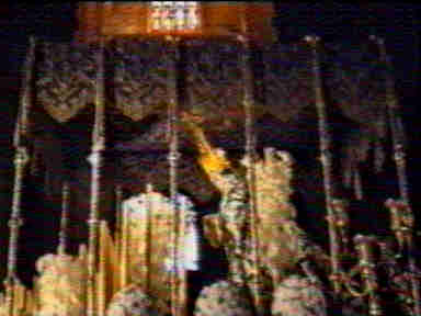 El continente como decía fue nuesta parque Temática Catedral de Sevilla y con un contenido de mas de trescientas piezas. El contienente esta quizás mas deteriorado con unas obras eternas en las columnas del trascoro y el contenido mas o menos es el mismo .- Dentro de esta exposición en las naves catedralicias durante los meses que duró la muestra estuvieron presente el Cristo de la Misericordias en su paso gótico y Ntra Sra de la Candelaria, en su característico pasopalio de azul y plata , como vemos en las imagenes .- La muestra estaba dividida en varias secciones y dentro de La Iglesia el Siglo de las Luces, ambos pasos formaron parte de la muestra , como representación de nuestra Semana Santa dentro de la Catedral .- En unas cartulinas se aportaban alguna informacion como la altura del Cristo 1.75m y de la parihuela 2.06 X 3.77 X 1,50. El Cristo es obra atribuida a Pedro Roldan y la canastilla del paso de Antonio Martin con dorados de Luis Sanchez . En cuanto al pasopalio la imagen mide 1,61m y las dimensiones del paso son 2,10 X 3,34 X 1,48 La Dolorosa es obra de Manuel Galiano Delgado y tanto las bambalinas como el palio son obra del genial Juan Manuel Rodriguez Ojeda .- Como vemos ademas de La Pasion dentro de Los Esplendores de Sevilla (Expo 92 .-en la Iglesia del Salvador, se sumaron estos dos pasos a la muesta universal .- VOLVER A PAGINA PRINCIPAL