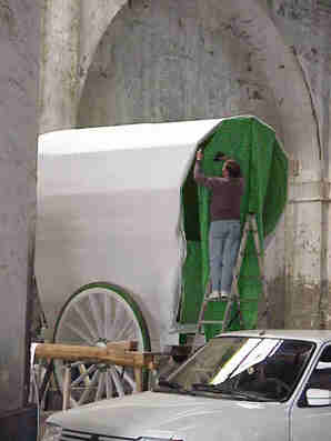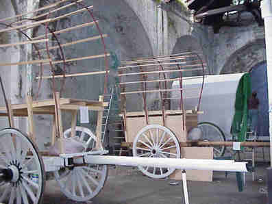 Sevilla 14 de Mayo 2002 Lo mimso que existe una priostía de Semana Santa de montaje de pasos y una "priostia" de Feria de montaje de casetas; El Rocio no iba a ser menos, tambien hay una oculta y callada labor de priostia rociera, que despues hacen el milagro de verse esas hileras de carretas atravesando el Quema o la Raya Real .- Aqui tambien esta el rollito de alambre, la rueda de calentito de la ilusión y donde antes habia un carro que dormia el sueño de los justo en algun almacen de un cortijo apareceran , estas carretas con su palio de arquillos , tableros y cortinas que se balancearan al vadear algún rio o al atravesar una jollanca .- En el trascón ( la parte baja ) estaba el alamcen de la comida ( conservada en sal o aceite ) y la bebida ( metida en nieve ) de facil acceso para los romeros ; en su parte superior con puntales y tableros el dormitorio y en la parte alta de los arquillos con cañas el "armario" donde se cuelgan las faldas rocieras y las chaquetillas de repuesto .- De la carreta sobresale la aguja donde van uncidos en yunta ( lo que se enganchan son los caballos , en los carruajes ) los bueyes, toros o vacas .-