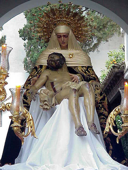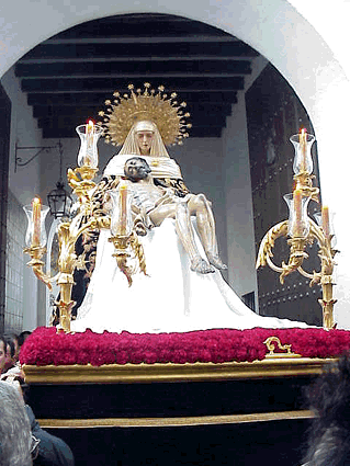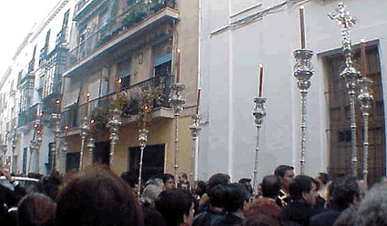 A su paso por la calle Sor Angela de la Cruz, ante el convento de las Hermanas de las Cruz Cabe señalar que las andas donde irán las veneradas imágenes de la Sagrada Mortaja han sido cedidas por la Hermandad de Pasión, las mismas que hace poco utilizo el Señor de las Penas de San Roque , en su sencillo, sobrio y discreto via crucis conmemorativo de su I Aniversario .-