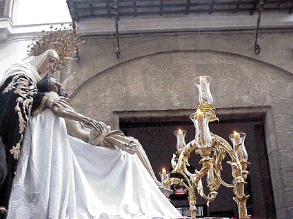 Nuestro Padre Jesús Descendido de la Cruz y María Santísima de la Piedad, en el momento de salir por la puerta de la Iglesia de Santa Maria de la Paz. Estas veneradas imagenes forman parte del paso de Misterio de la Sagrada Mortaja .-
