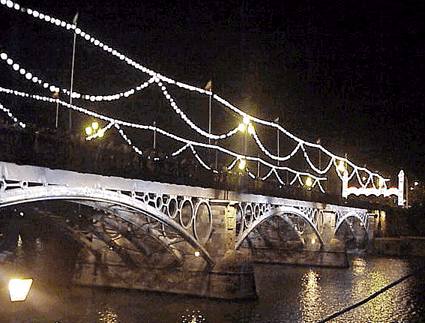 Hoy cumple el Puente de Triana exactamente 150 años , segun reza en dos placas de propio puente , en una de ellas se lee Puente de Triana nombre popular al que se le daba al oficial de Puente de Isabel II y la fecha de su construccion en otra placa en numero romanos , que como el personal anda chungo de esta numeración , lo podremos en numeros arábicos , 23 de Febrero de 1852 .- Es la primera construcción de hierro de la ciudad y de las pocas, como son el caso del Mercado de Barranco o la Estacion de Cordoba , hoy ninguna de las dos son ni mercado ni estación pero por lo venos las podemos ver .- No hay ninguna duda de que los autores del puente los ingenieros franceses Ferdinad Bernadet y Gustav Steinacher, mas que se inspiraron, copiaron descaradamente el puente de Carrusel de Paris o de los Santos Padres obra del ingeniero Antonine Remi Polonceau en 1834 y demolido en 1931 .- ¿Que