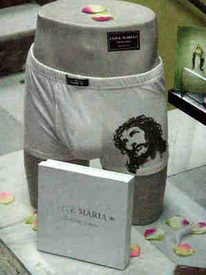 La imagen de la izquierda corresponde a una foto tomada en Sevilla, en un escaparate de un comercio sevillano muy proximo a donde las hermandades y cofradias sevillanas hacen estación gloriosa a saber, La Campana ( he dicho proximo a, no en ) .- ¿No me digan ustedes que no es una moneria ?; calzoncillos con Jesucritos con los atributos de la Pasión . A la derecha foto tomada del catalogo publicitario de esta colección de ropa intima , donde las devociones de gloria tambien tiene cabida como es caso que aqui vemos de Maria Auxiliadora , tanto para camiseta de caballero, como top y tanga de señorita , donde se puede apreciar la imagen de la Virgen en el mismisimo; sopongo que como hay tanto sida y tantas enfermedades venereas, es una forma de proteccion mas . la señorita y el caballero de la foto seguro que pertenece a algun grupo de Adoracion Nocturna y estan repasando jutnos el catecimso de Ripalda .- Oiga y esto esta al público en un escaparate en Sevilla y no pasa nada , incluso joven el o joven ella puende entrar y compralas con la mayor naturalidad del mundo .- Al parecer el diseñador/a, estaba ya cansado de tanto encajes , piel de angel , algondo o poliester cien por cien y como con toda seguridad tendra una profunda formacion cristiana, a tomado a Jesus y Maria en sus diferentes advocaciones para diseñar esta coleccion de ropa interior llamemeos devocional .- Ademas existen otras variantes de braguitas, tangas y calzoncillos con el Sagrado Corazon, la Milagrosa etc , no solo iba a ver bufandas con el Betis y el Gran Poder . No hay duda que un tanga con el Sagrado Corazon combate la tentación y los deseos impuros .- Lo que digo siempre los cofrades , sevillanos