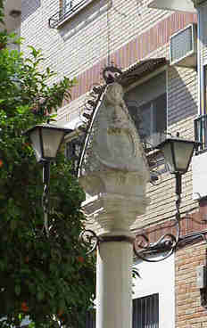 | JULIO DOMINGUEZ ARJONA Sevilla 13 de Mayo 2002 Estamos en pleno Viernes de Dolores rociero llegamos al recoleto Monumento a la Virgen de Rocio que tenemos en Sevilla y a pesar de estar en pleno corazon de Triana al estar en una calle sin salida quizas no sea todo lo conocido que debiera o debiese .- En la calle Valladares, pegadita a esa calle San Jacinto que tanto sabe de carretas, cohetes y Rocio en general, se encuentra un monumento erigido por el Círculo Cultural Rociero de Triana con motivo del XXV aniversario de su fundación que recuerda al monumento del Real del Rocío conmemorativo de la Coronación de Ntra. Sra. Del Rocío en 1919. La imagen de Ntra. Sra. del Rocío, sobre una columna de marmol esta alumbrada por dos faroles. De dicho monumento es autor el desaparecido artista Francisco Maireles Vela, el cual firma y fecha la imagen en la parte posterior de esta" El monumento es de 1997 , aunque la imagen de la Virgen la realizo Maireles en 1967 en piedra caliza y efectivamente es una réplica del Monumento de la Coronacion en El Real del Rocio fechado 1920 y que puede ver en LOS MONUMENTOS DEL ROCIO .- Cuando el proximo Jueves vea pasar las carretas por San Jacinto , entre por la calle Valladares y vea el monumento a la Blanca Paloma en Sevilla, el que piensan colocar en el Patrocinio seria ....el segundo .-