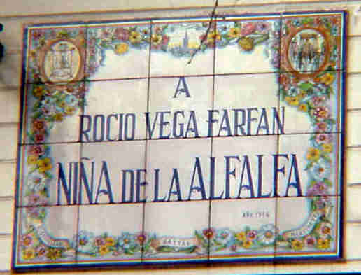 JULIO DOMINGUEZ ARJONA Como dijo el maestro Antonio Burgos es curioso como en la Plaza de la Alfalfa hay todo los domingos un mercado de pajaritos ( que por cierto ahora tambien se lo quieren cargar ; en Sevilla no solo van a destruir las plazas arquitectonicamente , sino tradiiconalmente) y con las cofradias que es por ella , en total unas dieciseis , no haya entre esas aves ningun domingo ningun pelicano ( El Amor), aguila ( Macarena), palomas ( palio del Rocio ) o gallos ( de la negaciones de San Pedro ) . En cualquier caso Sevilla una vez mas cuenta su historia en sus azulejos, en sus fachadas y como cuando se espera la llegada de una cofradia uno mira mas que un borrico atado, en la Plaza de la Alfalfa observara que hay dos y son eminentemente cofradieros .- El primero de ellos que ven en la parte superior esta dedicado a Rocio Vega Farfan, la "Niña de la Alfalfa", nació en Santiponce- Sevilla un 24 de marzo de 1895 . Este azulejo fue colocado alli en 1974. Rocio Vega Farfan era una afamada saetera de la época que tenia por costumbre todos los años cantarle una saeta en dicho enclave a la Virgen del Refugio de San Bernardo , Se da la curiosa anecdota que la Niña de la Alfalfa en la Feria de Sevilla en la caseta municipal le canto una saeta al rey Alfonso XIII( algo absolutamente fuera de lugar ) por la que el monarca la nombro "reina de la saeta" .- Murió en Sevilla, 16 de julio de 1975 .-