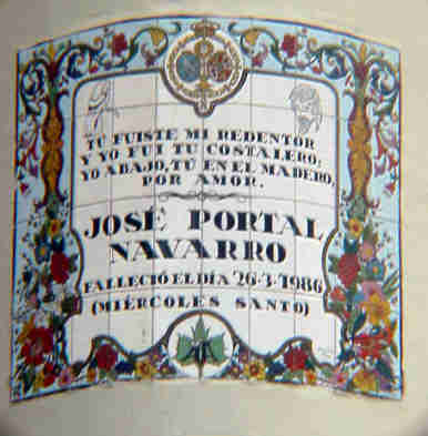 Y continuando en la Alfafa y con la Hermandad de San Bernardo , en una de sus esquinas hay este bello azulejo que la envuelve y esta colocado in perpetua memoria de un tragico suceso que ocurrio el Miercoles Santo 26 de Marzo de 1986.- José Portal Navarro era costalero de San Bernardo y al llegar a la plaza de la Alfalfa le sobrevino un mortal fallo cardiaco a los cuarenta y dos años de edad. Al año siguiente la hermandad descubrio en la fachada en un acto de fuerte emotividad de todos sus compañeros de las trabajaderas .- Como siempre les digo si se fijan en Sevilla