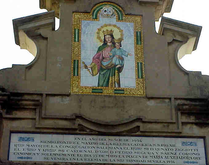 Usted coge la calculadora y ,oiga que si que lleva usted razon, en el Sevilla 2004, se cumplen las bodas de oro de esta coronacion con tos su habios , aqui no ha habido homologaciones de nuestro amigo Amigo .- Efectivamente Maria Auxiliadora ( de la Trinidad) fue coronada canonicamente el 13 de Mayo de 1954, por el cardenal Segura, en la Puerta de Jerez, es decir es la unica imagen que ha sido coronada canonicamente en una misa pontifical ,al aire libre .- Los padrinos fueron el Cuerpo de Aduanas de la que la venerada imagen es su patrona, siendo la corona obra de Emilio Garcia Armenta . Era la tercera imagen de Gloria que se coronaba canonicamente en Sevilla ,la primera la Virgen de los Reyes en 1904: el Sevilla 2004 se celebra el centenario; la Virgen de la Antigua en 1929, en el sevilla 2004 cumple las bodas de platino y Maria Auxiliadora en 1954, el proximo año cumple en cincuentenario de tal efemeride .¿Saldrá?.- Pero hay otras coronaciones de Virgenes de Gloria sevillanas que podrian ser perfectamente homologables por Monseñor Amigo como el caso de las Pastora de Capuchino en 1921 ( Coronacion Cerámica de la Pastora ).- No debemos olvidar tampoco que la Maria Auxiliadora de San Vicente en 1965 en plena plaza de San Lorenzo es coronada por el entonces arzobispo coadjuntor Bueno Monreal teniendo como padrino de la misma al entonces gobernador de Sevilla don José Utrera Molina . Pero la Maria Auxiliadora de la Trinidad ya habia sido coronada canónicamente en 1954 .-Maria Auxiliadora de San Vicente ¿ Coronada ? VOLVER A PAGINA PRINCIPAL