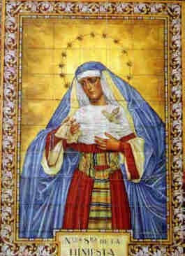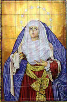 Acuso recibo de la cariñosa bronca de un curioso lector, que al parecer comparte como un servidor el gusto por los azulejos, donde me recriminaba pues hace que no comentaba ninguno .- Pues bien, que mejor manera de reanudar un recorrido cerámico por este auténtico museo urbano que es Sevilla ante cuyos lienzos pasamos una y mil veces sin reparar en ellos que traer aqui dos cuadros muy acordes con el época liturgica ne la que vivimos .- Cuando llega la Cuaresma es costumbre generalizada en nuestras hermandades y cofradias vestir a las Dolorosas a la usanza hebrea, a saber por lo general y salvo innovadoras genialidadess del prioste de turno , con tela lisa de raso de algodon ( ahora se a puesto de moda el terciopelo (?) , color rojo para la saya y azul para el manto y el tocado es blanco .con un celido cingulo listado en vivos colores , tocada por lo general por una diadema de estrellas. Salvo que la memoria me falle y necesite una dosis de rabitos de pasas creo que estos son lo dos unicos lienzos cerámicos donde vemos a dos Dolorosas sevillanas vestida de hebrea concretamente Madre de Dios de la Palma en la fachada de parroquia de San Pedro y Ntra Sra de la Hiniesta en la fachada de la parroquia de San Julian .- Ambas dos, son obra del siempre genial y nunca suficientemente valorado Antonio Kiernam Flores y los dos datados en los primeros años de la decada de los sesenta del siglo pasado ( XX) y su genialidad pictorica tuvo el buen gusto de retratar a estas dos Dolorosas vestida de hebrea , cuando lo mas usual y como se puede apreciar en fachadas de iglesias y casas de hermandad vayan vestida de reina .- Si estuvieran en el interior de algun museo recibirian