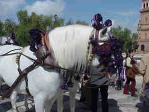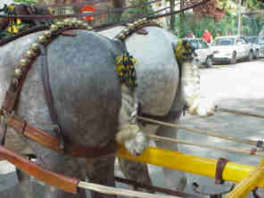 GUARNICIONES Por diferenciación como vemos en las dos imágenes calesera , siempre lleva en sus guarniciones cascabeles, la inglesa nunca, los arreos a la calesera son siempre de color avellana , a la inglesa la regla general es que sean negros, raramente son de color avellana .En la calesera el borlaje , es regla general en Ferias y exhibiciones , aunque también es correcto no llevarlos, a la inglesa jamas se lleva borlaje . En el cuello en caballo a la calesera lleva siempre tres piezas llamadas por orden Horcate, macho collera y entremanta . Al macho collera van atado los tiros- que siempre son de cuerda - y estos al coche ejerciendo la tracción .-