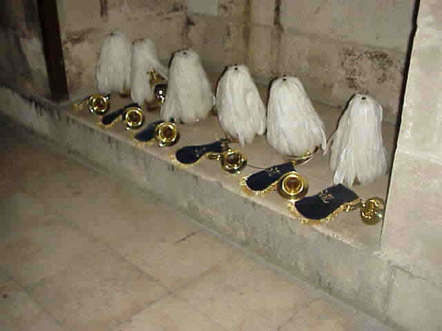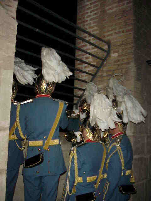 al interior de la torre, previamente se han arrodillado riendiendole honores honores a la Virgen de los ReyesComo aqui el cibermedalleo esta a la orden del dia ,pues miren un servidor en 1999 , tuvo el privilegio de asistir y fotografias este maravilloso acto y ademas fue el primero en publicarlo en internet, para mayor gloria de Sevilla , de sus tradiciones y de la Banda del Sol en la pagina de Don Antonio Burgos El Redcuadro , lo que pueden ver en CLARINES CELESTIALES : LAGRIMAS DE SAN PEDRO