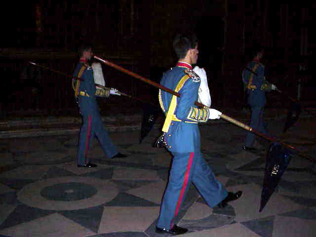 Los lanceros desfilan respetuosamente por el interior de la naves catedralicias acompañando a los clarineros