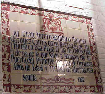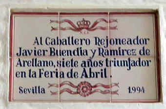 JULIO DOMINGUEZ ARJONA Sevilla 22 de Enero de 2003 Por aquello de que a primeros de Febrero comienza la Feria Mundial del Toro , que el Guadalquivir pasa bajo el puente de Triana , que sutedes saben que un servidor es el tonto del azulejo, y que un servidor sabe que sutedes van con mucha prisa hasta los toros con el movil en una mano y el vaso de güisqui en la otra y no se fijan en esta cosas ; hoy les traigo aqui una parte muy importante de la historia de la Plaza de Toros de Sevilla ( Maestranza ) escrita en azulejos ( como ven ustedes no todo van a ser hermanos mayores azulejeros ) .- Digamos que esta coleccion de azulejos, con la excepcion de la inauguración del Museo , son un publico in perpetua memoria o a toda una vida dedicada dedicada al mundo de los toros ; Curro Romero 44 temporadas ; Diodoro Canorea 40 emporadas de gestion de la Maestranza o Eduardo Miura cuya ganaderia se ha lidiado durante cincuenta años consecutivos .- Tambien estos azulejos son un premio al triunfo sobre el ruedo : el rejonaedor Javier Buendia triunfador siete años consecutivos; Manolo Vazquez salir con cincuenta años por la Puerta del Principe y treinta de alternativa ;la ganadera Doña Maria Luisa Dominguez y Perez de Vargas ganadora durante cinco años consecutivos el premio a la mejor corrida de toros ; Juan Antonio Ruiz "Espartaco" triunfado durante cinco temporadas consecutivas .- Como ven una especie de Gines ( Aljarafe ) Record , de proezas , de constancia , de continuidad dentro de la tauromaquia .- Como decia al principio esto es una parte importante del siglo pasado ( el siglo XX), pues la historia de la Maestranza de Sevilla es mas amplia y esta llena de anecdostas y curiosidades , algunas de ellas tristemente escritas como decia el titulo de Blasco Ibañez con Sangre y Arena .- Por eso la proxima vez que entre en la Plaza de