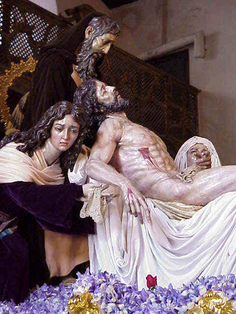 14 de Abril de 2002 Ella estaba alli, ella lo vio con sus propios ojos y lo ve años tras años un milagro que no figura en los evangelios, pero es un milagro "segun Sevilla" . Ella sostenia con su delicado pañuelo de encaje la mano del Hijo del Hombre. atravesada por el clavo y vio como una gota de sangre, se convetia en un rosa roja en un inmenso monte de lirios , vio en ese instante el inmenso poder de Dios .- A los hombres nos gusta jugar a ser dioses quizás olvidando como la leyenda hindu, de aquel mono que galopaba sobre el lomo de un tigre y se creia tan fuerte como él ;constantemente olvidamos que los designios divinos, van muchas veces reñidos con nuestras soberbias voluntades .la prueba la tuvimos ayer , una lluvia pertinas ,rompio todos nuestros, deseos, anhelos, esperanzas de un años y habra que esperar otro año para volver a ver lo que no vimos y que termino antes de empezar .Solo salio una Hermandad a la calle; la Paz, con un entrenado manto de blancura; si eso no es un mensaje que venga Dios y lo diga .- Hoy observe la mirada absorta de la Maria Magdalena de Santa Marta ensimismada en una rosa, color sangre de Cristo y su reflexión, somos solo una mota de polvo ante el inmenso Poder de Dios , que se hace solo su voluntad asi en la Tierra como en el Cielo y como siempre les he dicho .que para eso es Dios y no tiene que darles explicaciones a nadie .-