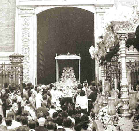 Sevilla 24 de MAYO de 2003 El Salvador o Sevilla ,como la quiera llamar // como la quieran llamar .... Em impacto del Nunca Maix.Salvador , tambien ha llegado al Rocio y solo hace unos dias veimos el TRASLADO EXTRAORDINARIO DE LA VIRGEN DEL ROCIO DE LA HDA DE SEVILLA A SAN ISIDORO , en la misma diaspora que se vieron obligado en plena Cuaresma y Semana Santa la Hermandad del Amor y Pasion ( aunque cada una inexplicablemente por puertas diferentes ) .- El priximo 5 de Junio del año en curso, cuando las carretas salgan de la Fabrica de Artilleria por la calle Cofia del barrio de San Bernardo VER , encaminara sus pasos como siempre para la Plaza del Salvador, donde este año se celebrara la Misa de Romero en el atrio de la Parroquia del mismo nombre, cosa que se hacia antiguamente como lo prueba esta foto fechada el 22 de Mayo de 1969 , donde se ve la imagen de la Virgen del Rocio en la puerta del Salvador y a sus plantas el altar rodeados de devotos y rocieros, mientras la Carreta del Simpecao aguardaba la finalizacion de la misma, para iniciar el camino de ida .- Esta costumbre se perdio y la misa de romero , que casi todas son al aire libre, se comenzaron a celebrar en el interior del templo. Este año desgraciadamente por las razones que ustedes ya conocen hasta la saciedad, se volvera a recuperar esta imagen pero con la presidencia del Simpecado y Sevilla vera como Los naranjos de las plazas blancos se vistieron // y Sevilla hecha pueblo cierra sus puertas porque se va de romero // la Primavera otras vez la primavera // La Primavera ha venido // Y la gente rociera otra vez se va al Rocio .- O por inicativas de juntas de gobierno o priostes o por desgraciados sucesos como los del Salvador,por suerte en unos casos y por desgracia en otros , estamos viendo imagenes , que generaciones preteritas de sevillanos contemplaron en otros tiempos .-
