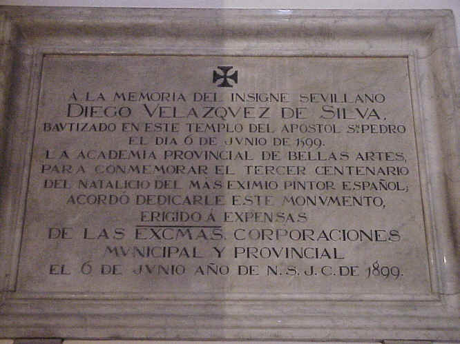 18 de Julio de 2004 Como siempre les digo en Sevilla hay que mirar mas que un borrico atado, para la izquierda ,para la derecha, para arriba y para abajo ; y si uno acerca la oreja a paredes y muros te cuenta historia de Sevilla y los sevillanos .- El otro dia ,mientras contemplaba como exhornaban de flores el palio de la Virgen del Carmen de Santa Catalina en la Parroquia de San Pedro tuve la oportunidad de leer tranquilamente esta lápida conmemorativa, del bautizo del inmortal pintor, que se celebró en dicha parroquia Con la maquina de calcular de los deditos ( esa nunca falla ) ; hace la broma de cuatrocientos cinco años de dicho bautizo y un siglo y cinco años desde que se instalo la placa de marmol ( aqui en Sevilla hasta las lapidas son centenarias) .Lo milagroso es que todo esto haya llegado a nuestros dias, en esos 405 años se nos cruza un Ayuntamiento o Palacio Arzobispal como el que padecemos y seguro que no lo habriamos contado , con tanta restauracion eterna, tantas obras y tantos andamios Los padres de Velazquez se casaron en esta misma parroquia el 28 de Diciembre de 1597 , Joao Rodriguez de Sylva y Geronima Velazquez , ambos sevillanos pero de ascendencia portuguesa. Si usted es un curioso lector se habra percatado que en la lapida se han hecho un lio con el nombre al poner "Velazquez de Silva".- Dada la ascendecia portuguesa , el genial pintor tomó como primer apellido el de su madre ( como ocurre en Portugal y ademas seria lo correcto ) y de segundo el de su padre. No obstante en otros lugares aparecen con el orden de apellidos español actual a saber primero el padre y despues la madre . Tambien hay que tener en cuenta que en el siglo XVI y XVI , el tema de los apellidos no funcionaba como ahora , un hijo/a podria tomar los apellidos de su padre o madre y hacer las combinaciones que quisiera y mas le interesara segun el abolengo de sus predecesores. Se podria dar el curioso caso de tres hermanos de un mismo padre y madre tener los apellidos tan mezclados que no parecieran de una misma familia .- Con todo lo que hay dentro de San Pedro se podria