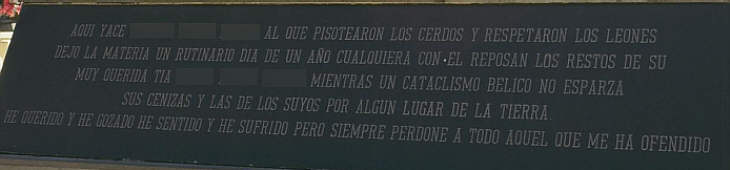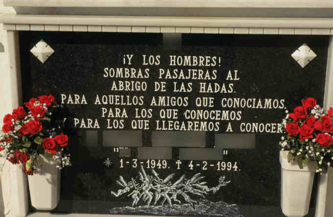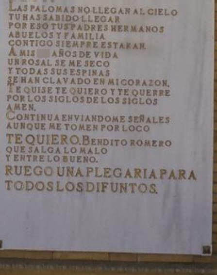 Pero hoy, y en unas sucesivas entregas, vamos hacer un recorrido anécdotico , parandonos en las curiosidades . que si se fijan se pueden ver en dicho campo santo. Obviamente para no herir suceptivilidades, he quitado de la fotos, nombres y apellidos , situacion en las calles o datos que pudieran identificarlos, lo que si les aseguro, es que estan alli .- Estas curiosidades estan compuestas no solo por las tumbas o lapidas en si, ademas he tenido en cuenta los exhorno florales que hay en algunas de ellas .- LITERARIOS Parece como si en vida, no hubiera hablado de todo lo que habia que hablar y las lapidas se volviera autenticas cartas al mas alla ,lejos del telegrafico "DESCANSE EN PAZ" .-
