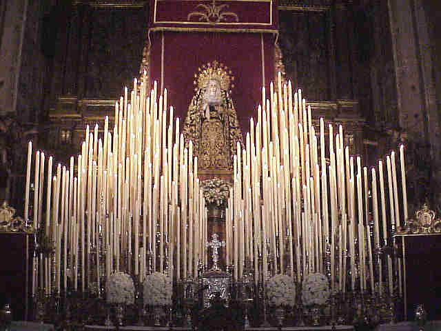 23 de Febrero de 2003 Ayer comenzo el unico Quinario que se celebra en Sevilla dedicado en EXCLUSIVA ( he dicho exclusivamente ) a una Dolorsa en este caso La Soledad de San Lorenzo, tenga el buen gusto de verlo, pues cosas como estas solo se ven en una semana al año .- Si tiene aun mas gusto vayan a eso de la siete y media de la tarde y vean a los Santizos, en el dificil arte de enceder, como encienden esta inmesa candeleria formada por mas de 300 candelabros con sus respectivas velas . Casi una vela encendida por cada dia del año ,que los jartibles esperamos la llegada del Domingo de Ramos y que empezamos a contar cada vez que las puertas de San Lorenzo que cierra como las tapas de un coleccionable que escribimos cada año durante solo una semana .Esto es un altar de Quinario segun Sevilla, aqui no hay nihilismo postconciliares de cuatro velitas y dos ramos de flores mal puesto , de eso veran ustedes tela del telon y tras algun telon mal puesto .- Hoy Miercoles de Cenizas , se arranca un recta final de una carrera de fondo que muchos llevamos corriendo todo el año . Se sucederan multitud, de quinarios, triduos, septenarios, novenas, besamanos, besapie, via crucis, pregones, proyecciones, conferencias, y un interminable e inabarcable etc .- Sirva esta imagen del inconmensurable altar soleano con tarjeta de felicitacion Cuaresmera para todos mis lectores y para todos lo que dicen que no me leen y sobre todo para aquellos que no sabriamos entender la vida , sin unas visperas, sin una espera, sin un sueño, sin un anhelo ,pues siempre las mejores Semanas Santas son las soñadas .- Que Dios reparta suerte, pues con tantos, andamios, obras, niñatos, cecop, atasco, hoteles incomprensivos, politicos fotogenicos, hermanos mayores mas fotogenicos, subidas de tarifa de taxis, no les quepa duda que nos va hacer falta y Maria Santisima en su Soledad, nos ilumine en esta Cuaresma , con la misma luz que irradia desde este altar de Quinario .Como dice los soleanos Paz y Bien ....en la medida de los posible .-