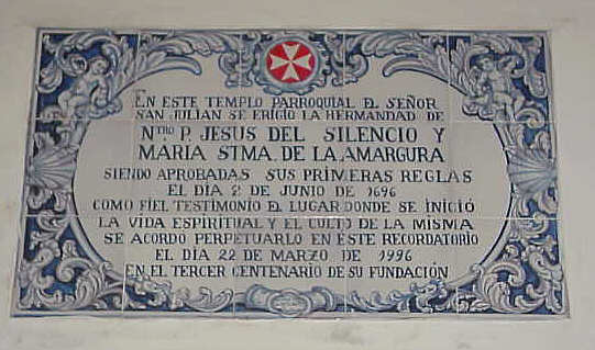 9 de Marzo de 2004 Pues como reza en el lienzo cerámico fue en San Julian, donde se fundo la Hermandad de la Amargura ( al parecer con este azulejo no hay ninguna polemica, entre los autoproclamados doctores del capilleo ) en 1696 y efectuaria su primera estacion de penitencia desde alli en 1699 hacia la catedral y lo haria con una Dolorosa que pertenecio a la Hermandad de la Hiniesta que por aquel entonces estaba extinta .- Pero lo realmente curioso de esta historia es que estuvo alli hasta 1724, es decir veinticinco años y pudo haber continuado ,i si no llega a surguir una desavenencia insalvables entre el entonces mayordomo de la hermandad , Juan Milla ( todo un personaje) y el parroco de San Julian ( uy esto me suena desavenencias parroco - hermandad en el siglo XVIII no hay nada nuevo bajo el Sol- curioso eso de Sol me suena mas todavia - ) lo que motivo que la hermandad cogiera los bartulos y se fuera con la musica a otra parte y que no es otro sitio que San Juan de la Palma ,,,,y continua alli .- Lo gracioso del caso es que este buen señor Millan a pesar de todo se oponia al traslado , pues regentaba una taberna ( les recuerdo que estamos en 1724) , donde tenia en permanente exposicion las imagenes del misterio , a saber Herodes, romanos sayones etc , por lo que usted se podia tomar un tinto ( la cruzdelcampo aun no estaba inventada ) con una tapita , en compañia de los personajes secundarios del misterio de la Amargura :- Como ven esto de las tarbernas kofrades tampoco es un nuevo invento , donde supongo la sin hueso funcionaria perfectamete y y los hermanos se despellejarian ademas de vivos , fraternalemnte en Cristo exactamente igual que como lo hacen ahora .- Confiemos que estas lineas no las leal el dueño de ningun bar capillita, pues culaquier dia vemos, algun romano, algun negro o algun judio tras la barra de un bar con olor a incienso y donde Dolorosa y Cristos comparte paredes con rutilantes top modell en top less, entre botellas de Soberano y JB