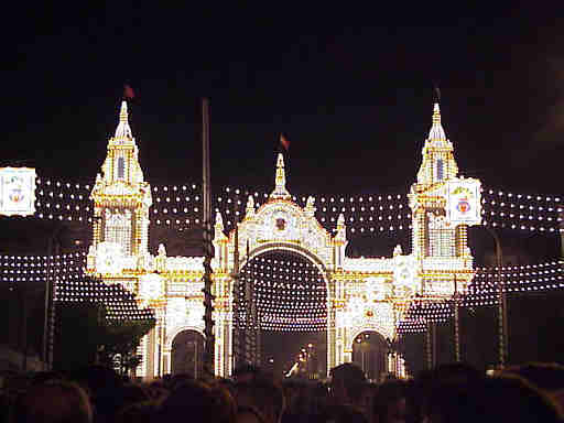 Es la version sevillana de las doce campanadas de la Puerta del Sol de Madrid. Quizas sea el momento en que la Feria que ha sido por un instante de los sevillanos en el interior de sus casetas a lona cerrada , con el tradicional pescaito frito, que originariamente se tomada , mientras se daban los ultimos toques a la casetas de ultima hora ,(algo tambien muy sevillano ) , hoy es una fiesta de etiqueta de trajes oscurros, mantones de Manila, corbatas de dieños, tacones de vertigo y al iluminarse la Portada y todo el Real, en ese preciso instante le es arrebatada a Sevilla y es entregada a nuestros visitantes, una fiesta indiscutiblemente mucho mas internacional que nuestra Semana Santa, pues pasarlo bien dificilmente necesita traduccion o interpretacion .- Curiosamente todos los dias se ilumina la Feria en el momento exacto que los caballistas y carrujaes abandonan el paseo , pero como las madres alumbrao solo hay uno, el primero. Nuestra corporacion municipal como una especie de oficios por lo feriantes, acompañada por la banda municipal , se encaminda desde la Caseta del Ayuntamiento, hasta la Portada y aprietan el boton de la iluminacion y da a luz y da la luz al milagro de una nueva Feria .- Quien sabe ,como nuestro Alcalde es tan dado ultimamente a importar fiesta nacionales cualquier año nos sale con un chupinazo o con una mascletá .-
