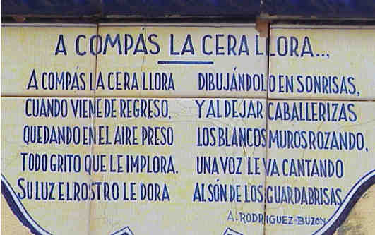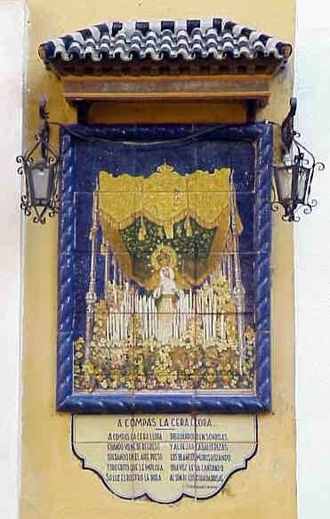 21 de Enero de 2003 A modo de Trivial Sevillano o el maletin con poco exito "Casco Antiguo de Sevilla" que edito el Area de Cultura de nuestro querido Ayuntamiento y por aquello de que ha vuelto el Un , Dos, Tres les preguntaria saben ustedes donde esta este sevillanisimo azulejo ( ya saben un servidor es el tonto del azulejo ),¿ Quieren pistas? Como pista les dire que es el unico caso en Sevilla donde parte de un Pregon de la Semana Santa de Sevilla es inmortalizado en un lienzo cerámico .¿Otra ? , el pregonero logró emocionar tanto a la concurrencia que a la finalizacion del mismo lo sacaron a hombros del entonces Teatro San Fernando.- Otra buena pista es que lo dio muchisimo antes que Carlos Herrera y Joaquin Caro Romero ( nota para los cofrades de toda la vida y los prensa morada , le pregon de la Semana Santa de Sevilla es anterior a estos señores ) .- ¿Se han fijado en el paso de palio que se puede ver ?, si se fijan detenidamente en el techo de palio ( la giralda entre dos azucenas ) podran averiguar perfectamente a que Virgen y Hermandad pertenece y por su recorrido averiguar la calle .- ¿Se rinden? , pues pasen y lean ( a ser