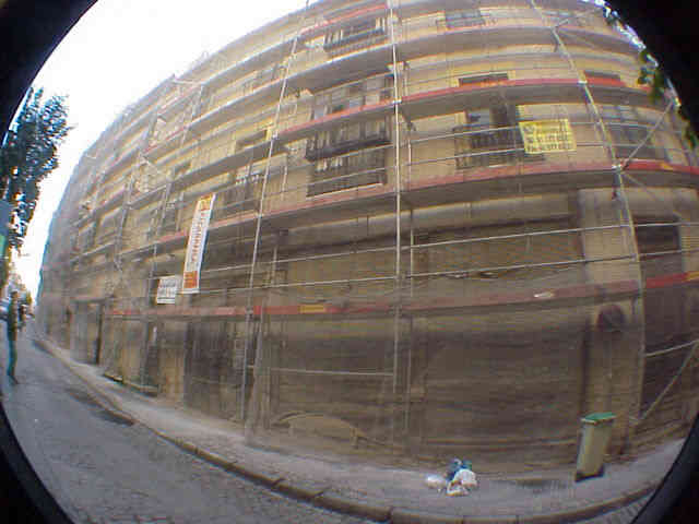 la parroquia y el andamio color azul de la Iglesia de Ntra Sra de la Paz