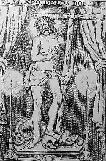por los clavos, apoyado sobre la Cruz, con un pie encima de una cráneo