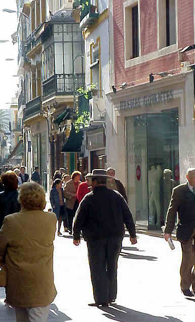 12 de Febrero de 2003 Esta imagen que aqui ven es todo un simbolo étnico viviente que raya en la antropologia y terriblemente comprometido por el siempre acomplejante tipico topico .- Me explico; son muchas personas de España y fuera de ella que erroneamente siguen pensando que aqui estamos todos el dia como este señor con el sombrero de ala ancha puesto y tomando manzanilla y nuestra señoras estan con la bata de flamenca , el clavel en la cabeza y en la liga la navaja . Cuando curiosamente donde estan todos el dia con la chapela puesta es en las Vascongadas , oigan y sin problemas .- Esta imagen que aqui ven , no es d eun dia de Feria o camino de los toros , es de ayer a media mañana en plena calle Sierpes y les aseguro que es lo mas parecido a fotografiar a un ovni o a Fernando Villalon que hubiera viajado en el tunel del tiempo . Toda una estampa de ayer ; un buen señor con su sombrero de ala ancha , y digo bien en esa diretriva a modo de santisima trinidad sombrerera de dos sombreros diferentes pero una misma Andalucia ( por aquello del Cañero troncoconico ), su botas de elastico , sus pantalones de rayadillo y fumandose un de puro , de complejos , de ridiculos y demas tonterias autonómicas .- Hubo un tiempo en que esta misma imagen, en esta misma calle era lo habitual, los inmensos circulos de tertulianos de tratantes y conoceores que hacian tratos firmados con apretones de mano, frente al Mercantil o en las Cuatro Esquinas de San Jose y que remataban en Casa Calvillo , Los Corales o el Pasaje Andaluz. ., liaban tabaco negro y miraban la hora en relojes de cadena .- Todos los años dibujo una beatifica sonrisa cuando cada Feria te salen en la prensa unos buenos señores hablando de la Asociacion del Sombrero de Ala Ancha ,! en plena Feria ! cuando en el paseo de caballos se ven miles de sombreros como estos y el resto del año ¿donde se mete esta asociacion ?. Con toda seguridad el protagonista de esta foto posiblemente no sepa ni que existe dicha agrupacion, ni puñetera falta que le hace .,pues el ejerce de saber llevar un sombrero todo el año ,lo que tiene muchisimo mas merito .- Deberiamos de imitar de este buen señor y de los vascos, la prestancia y dignidad de como se lleva los simbolos de tu tierra, ellos sus chapelas y nosotros nuestro sombrero, pues somos muy dado al acomplejamiento etnico quizas olvidando que una de la enseñas mas universales no solo de Sevilla, Andalucia y España, para la humanidad es lo que este peaton lleva con toda solvencia en la cabeza , diciendo sin problemas "Aqui voy yo" .- "Niña dame er maquedado"; voz muy frecuente que se oian en zajuanes o patios en penumbra en clara alusion a la marca de fabricante de sombreros que rebautizaba dando nombre a lo fabricado . Ademas del mitico Maquedano; Padilla Crespo , con su lema ,tambien como arrancado de las vascongadas; "El jornal para los nuestros" (y que curiosamente aun no acabamos de pillarlo, sobre todo en lo que a la Charitas (dimitivo de Chari se refiere) y tambien no podemos olvidar de nuestra Alcaiceria de la Loza que entre capirotes invertidos del Poligono Industrial de la paralela calle Herbolario ; todo un escaparate de sombreros de Garcia, cuyas sombrereras portada por jovenes de patilla de hacha o señoritas con la medallitas de Sevilla o Triana al cuello , son anuncio de que ya huele a Feria o a Rocio .- Al final nos hemos quedado con el complejo y encima con el sanbenito del tipismo d epandereta Un servidor ayer casi se le arranca un olé, que no solte por miedo a que alguien pudiera o pudiese pensar que estaba dicho desde dentro de algun armario ; en su lugar quede este pequeño texto como homenaje a quien se pone nuestra tierra por sombrero sin acomplejamiento de segundas modernizaciones. Si todos hicieramos lo mismo no solo en lo que al tocado se refiere sino a todos los demas, en los que a nuestra Sevilla y Andalcuia se refiere otro gallo del Carmen Doloros nos cantaria
