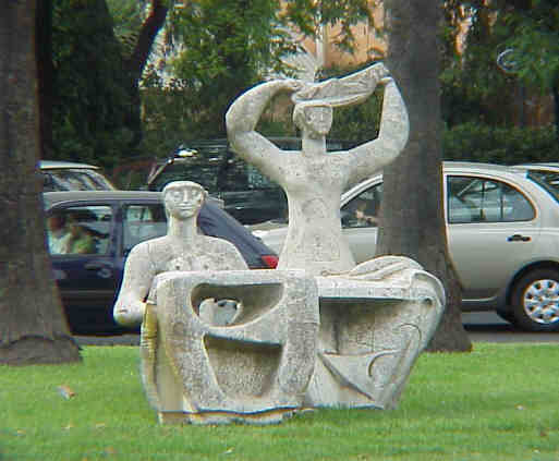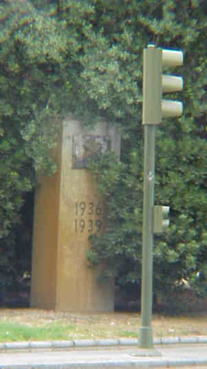 6 de Julio de 2004 En el barrio de los Remedios la Glorieta de Alferez Provisional ( hoy absurdamente rotulada Glorieta de las Cigarreras, cuando la cigarreras nunca cruzaron el rio , siguiendo a la Fabrica de Tabacos y se quedaron como dice la sevillana del pali , en la calle San Fernando , atrapadas en un cuadro de Grosso ), glorieta formada por el Puente del Generalisimo ( hoy Puente de de los Remedios , con la Avenida del Presidente Carrero Blanco ( hoy Presidente Carrero Blanco ).- En esta glorieta se puede observar el típico acomplejamiento historico español, como ven a su derecha un monolito de granito con la estrella de Alferez , dedicado a los Alfereces Provisionales 1936- 1939 .- Posiblemente muchos lectores se preguntaran , que hicieron estos Alfereces , pues bien estos oficiales del ejercito, no profesionales, que procedentes de las universidades o con estudios superiores y una edad mayor de 18 años cumplidos fueron admitidos en las Escuelas y Academias militares a partir de Octubre de 1936 y tomaron parte de la guerra hasta 1939. Fueron un total de 30.311 de los que murieron en combate cerca de 3.500., alfereces provisionales y terrorificamente jovenes - Como todo esto huele a Guerra ( In)Civil, nuestros sucesivos Ayuntamiento no se han atravevido a retirar el monolito, y han hecho algo peor dejarlo sumido en el abandono que actualmente se encuentra , casi devorado por las ramas de un arbol .Posiblemente en la lista del PA de monumentos en mal estado seguro que no figura este .- Decia Ezquilache "Aquellas naciones que olvidan su historia estan condenadas a repetirla ". La Guerra Civil española fue una etapa de nuestra historia terriblemente trágica que deberia de estar permanentemente presente en nuestras vidas precisamente para eso, para que nunca vuelva a suceder , aunque por otro lado jamas debemos olvidar y avergonzarnos de las concadenadas etapas de nuestras historia que su suma hacen que hoy estemos donde estemos y seamos lo que somos .- En la zona central de la Glorieta esta el monumento cuya foto ven a la derecha titulado Muchachas al Sol, un titulo de lo mas veraniego y que les aseguro que en la proximas playas de Huelva y Cadiz, en estos dias y fines de semana estan poblando de muchachas al Sol ( de carne y hueso ) , habidas de broncear sus cuerpos .- Muchachas al Sol , esta fechada en 1962 y es obra del escultor vanguardista Antonio Cano Correa ( tambien autor del otro monumento que esta al otro lado del puente , Monumento a Juan Sebastina Elcano ).- Esta obra originariamente fue concebida para la Plaza de Cuba, aunque acabo durante una etapa en el Parque de Maria Luisa , donde hoy se alza el monumento a Dante Aligheri obra de Juan Abascal y fue trasladada a su actual ubicacion , donde ya lleva bastantes años .- Dos monumentos, dos tratamientos distintos, visiones