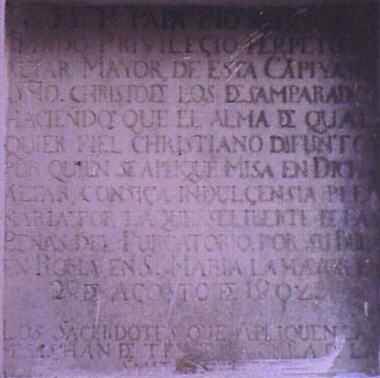 Hace referencia a la por ahora la capilla del Cristo de los Desamparados, capilla que está en el meritado patio, fuera del edificio de la iglesia del Salvador. Antes de que acabara el año y aun en caliente el inmeso vacio que ha dejado el Señor de Pasion :los resposables , de la restauracion del Salvador se han dejado caer con la primera idea iluminada, de cerrar el patio de los naranjos, donde esta esta lapida, con una montera acristalda, para hacer un salon multiuosos .- Ignoramos si los asistentes a algun acto de esa sala multiusos acristalada gozaran de alguna indulgencia de la que hablaba Pio VII . Por cierto como mis niños de la L.O.C.E no sabrán este Papa, tenian mucho en común con nuestro Cardenal,que le gustaban mucho las coronaciones ,pero no de Virgenes, sino que coronó al mismisimo Napoleon, como Emperador, bueno es un decir, pues nuestro querido Bonaparte en un acto de extrema soberbia le arrebató la corona al Papa y se la impuso el mismo .- Asi que por favor , en la restauracion del Salvador de Iglesia Parroquial, en sabe Dios que, que busque algun buen marmolista de esto que hay cerca del cementerio y rectifique la placa y donde pone : ALTAR MAYOR DE ESTA CAPIYA DEL