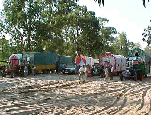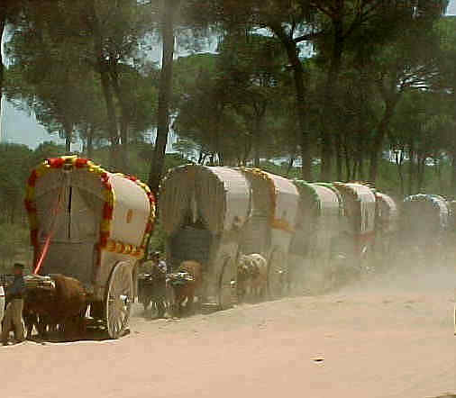 15 de Mayo de 2004 El Rocio , como la Semana Santa es objeto de ensoñacion para los capillitas y jartibles rocieros, que se llevan todo el año pensando en los pinos, en las arenas y en los caminos .Pero como la Semana Santa la mejor es la soñada , con El Rocio ocurre lo mismo, pues existe un notable desafase entre el ser y lo que deberia ser o fue en su dia .- Como muestra que mejor que estos dos botones . En la imagen superior una imagen idilica rociera de dificil visión. Una hilera de carretas atraviesa cansinamente la Raya, por una alfombra de arena, teniendo como telón de fondo la inmensidad de los pinos . Rodeados de silencio, se puede escuchar hasta el crujir de las ruedas de maderas o de las cuerdas con la que se unsen los bueyes. Con un poco de suerte escuchará una solitaria sevillana a capela, sin guitarra, sin tambor, sin palmas . El Sol se entrecortara por los troncos de los arboles y trazando zurcos de luz , dará a toda la estampa una iluminación casi celestial y por un instante, solo por un instante; pensará que esa caravana va camino de esas marimas azules que se encuentra en los Cielos .Esto les aseguro es muy dificil de ver .- En la imagen inferior una division acorazada, donde la Raya se combierte en una especie de autopista de cuatro carriles. Los tractores son los bueyes; las carretas son las carriolas ; los boyeros tractoristas ; el silencio es sustituido estruendo de motores al limite de su potencia y no es que si alguien se pudiera cantar una sevillana, ,es que si pegara un grito de socorro, nadie lo podria oir. Esta usted ante una especie de Paris Dakar, pero por lo agricola, por lo campero . Esto es la moneda de cambio del Rocio .- Pero hemos de ser realista , existe una absurda, inviable e ignorante tendencia , a que los caminos rocieros, sobre todo a la zona del Parque y PreParque de Doñana, ( que cualquier día sus linderos llegarán a la Plaza Nueva ), de recuperar , la forma romántica y antigua de ir al Rocio como la foto superior y relegar , el transporte mecanizado a las carreteras secundarias que llevan a la aldea y esto es sencillamente una utopia, . El camino de muchisimas hermandades sencillamente desaparecerian .- La Semana Santa esta masificada, la Feria esta masificada, El Rocio no iba a ser menos, todos queremos ir a los mismo sitios al mismo tiempo ; nadie se quiere perder nada , en este Estado del Bienestar ( en el que por lo visto vivimos ) todo el mundo puede ( aunque no pueda para eso se inventaron las polizas de credito ) vivir todo esto y atención con todo tipo de comodidades y con todas las molestias ( nada romanticas ) que ello comporta ( cerveza helada, ducha con agua caliente, literas con sabanas etc) y hoy no cabe en ninguna cabeza, beberse el vino caliente; alumbarrse con un candil de gasoneno ; domir bajo una carreta en un suelo lleno de garrapatas y no ducharse en tres dias .- El Rocio se debate entre estas dos caras de la