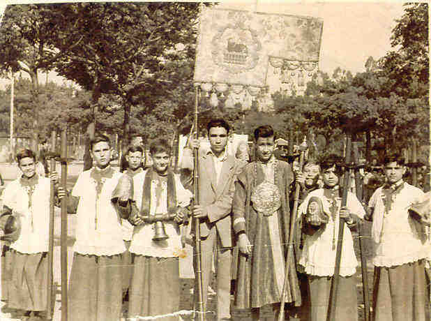 se celebraba por el barrio y posa la chavaleria portando el Guion Sacramental,
