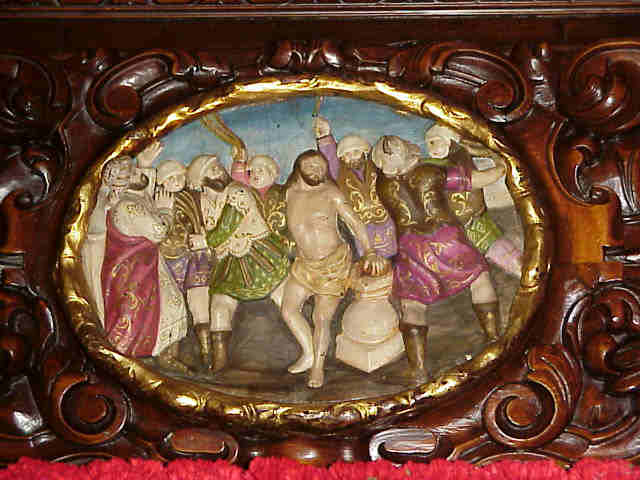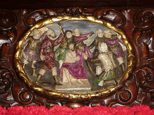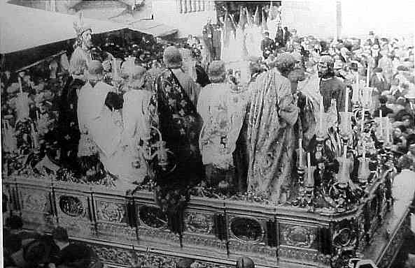 1 de Noviembre de 2004 Por aquello que este fin de semana tendremos nuestra procesión extraordinaria semanal; ahora le toca a la Hermandad de la Cena ;( como ocurriera hace XXV años - Virgen del Subterraneo XXV Realeza de Maria,- este año al cumplirse el Cincuentenario de la Realeza de Maria ) en esta Cuaresma , con todas las letras, otoñal , les traigo aqui una fotografia del ayer de dicha hermandad, digna de un detenido analisis.- En primer lugar la Hermandad de la Cena se encontraba en Omnium Sanctorum, fijenses en la parte superior central de la foto donde se ve un trozo del caracteristico pórtico de dicha parroquia , alli estuvieron hasta 1936 fecha en que se trasladaron a los Terceros , tras el incendio provocado por saben ustedes quien en la PreGuerra (in)Civil Ya de camino observen las túnicas de los nazarenos , con capa y antifaz de color, cuya túnica cambiarina en 1954,por la actual .- En el paso vemos el Señor del imaginero Manuel Gutierrez-Reyes Cano de 1860 y que seria sustituido en 1955 ( 95 años despues) por el actual obra de Sebastina Santos. El apostolado es de 1897 obra del escultor Manuel Perez Guisbert . sustituido en 1938 por los de Antonio Bidon Villar El paso que ven era de la Hermandad de la carreteria adquirido a la misma en 1920, obra de Manuel Rodriguez Espinosa en 1920 , donde observaran carteles de relieves , que hoy se conservan en el paso actual del Misterio de ela Cena .- Estas interesantisimas cartelas de 1677 son obra de Cristobal de Guadix, Luis Antonio de los Arcos y Pedro Roldan, que fueron policromadas, con poco acierto, en 1966 por Luis Jimenez.-