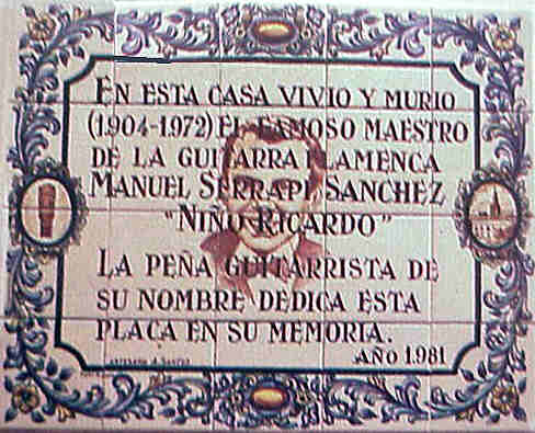 29 de Noviembre de 2004 Señores se nos estan yendo el 2005, aunque seria mas correcto decir que el tiempo no pasa, sino los que pasamos somos nosotros y va uno haciendo balance del presente año ,lleno de efemerides cofradieras de centenarios, cincuentenarios y mire usted por donde desambulando en estas soleados dias de otoño y cin la mania que tiene uno de mirar mas que un borrico atao, Sevilla te grita desde sus paredes que hay otros centenarios que aqui les traigo .- En la parte superior vemso este azulejo dedicado a Manuel Serrapi Sánchez guitarrista universalmente conocido como el Niño Ricardo cuya placa la podemos observar en su casa, en la calle Almudena num 5. En la presente web tambien les hablé en su dia de este mito de la historia del flamenco sevillano , al tratar el magnifico Mausoleo al Niño Ricardo ,sito en el Cementerio ( Museo- Parque Escultorico ) de San Fernando donde se hacia referencia a su vida y obra . Este año se cumple el centenario de su nacimiento .-