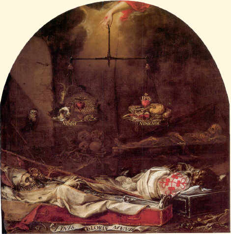 3 de Noviembre de 2004 No hay duda que el muso de Valdel Leal, fue el propio Mañana y su obsesión por la muerte ; siendo la fuente de inspiracion de la impresionante obra que aqui vemos se corresponde en parte con un párrafo de su libro Discurso de la Verdad : "Si tuviéramos delante la verdad, ésta es, no hay otra, la mortaja que hemos de llevar, viéndola todos los días, por lo menos con la consideración de que has de ser cubierto de tierra y pisado de todos, con facilidad olvidarías las honras y estados de este siglo; y si consideraras los viles gusanos que han de comer ese cuerpo, y cuán feo y abominable ha de estar en la sepultura, y cómo esos ojos que están leyendo estas letras han de ser comidos de la tierra, y esas manos han de ser comidas y secas (...). Mira una bóveda: entra en ella con la consideración, y ponte a mirar a tus padres o a tu mujer (si la has perdido) o los amigos que conocías: mira qué silencio. No se oye ruido; sólo el roer de las carcomas y gusanos tan solamente se percibe. Y el estruendo de pajes y lacayos ¿dónde están? Acá se queda todo: repara las alhajas del palacio de los muertos, algunas telarañas son. ¿Y la mitra y la corona? También acá la dejaron." En este soberbio jeroglifico de las postrimerias de la vida , Valdes Leal da a su obra no solo un desgarrador realismo sino que lo combina perfectamente con un tremendo juego simbolico .Por un lado ,nos muestra la atmósfera húmeda y fétida de la tumba; en el primer término, , los insectos y gusanos ( antes de que nos lo enseñaran en C.S.I Miami ) devoran una cabeza del obispo con todos sus atributos , una inmediatez a la carne en descomposición. En segundo plano un caballero con la cruz de Calatrava, en otro estadio de descomposición . En el fondo, planean súbitamente las tinieblas; una ráfaga de luz amarillenta ilumina la cabeza de una lechuza; un ataúd y un montón de huesos, representan la fase final de la muerte. En un solo fotograma , Valdés obtiene una atmósfera terrorificamente estremecedora, haciendo paradogicamente de la muerte algo vivo .- En cuanto a la simbologia en la parte superior del cuadro vemos una mano estigmatizada , la mano de Jesus , que aguanta una balanza, alusión simbólica al juicio final. En el platillo de la izquierda están representados los siete pecados capitales mediante animales simbólicos, en el de la derecha los libros de oración y las penitencias cilicio y cadena. . La Muerte hace de la existencia terrenal algo efimero y sin sentido, ( ya lo decia Burt Simpson : "la Vida es una enorme perdida de tiempo" ) pero al mismo tiempo libera el alma para que sea juzgada según su existencia terrenal .Ante el terror a la muerte el consuelo la esperanza de la Salvación .- No sabemos si este cuadro inspiro al inventor de los crematorios ,pero lo que si esta claro es que en una ridicula sociedad, donde se nos vende publicitariamente una falsa juventud eterna y una vida igualmente eterna ; este es el final y les aseguro que no hay nada mas democratico que la muerte, y eficaz remedio contra la soberbia y la avaricia ; pues a todos nos llega por igual , lo unico que nos diferencia es el cuando, para algunos demasiado pronto, para algunos demasiado tarde .- Curiosamente nos preguntamos si hay vida despues de la muerte y quizas la respuesta seria ,que hay lo mismo que antes de la vida . Disfrute de este mundo, pues por ahora es el unico que conocemos Bebed y comed hoy, que moriremos mañana, era el lema del Renacimiento y el de un servidor .- VER : In ictu oculi