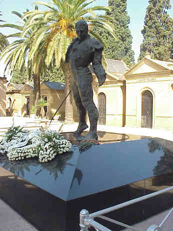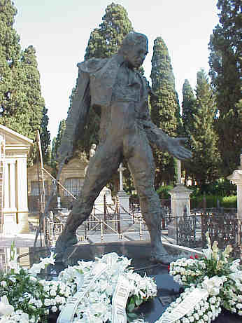 28 de Septiembre de 2004 El pasado domingo 26 de Septiembre hizo veinte años de la trágica muerte de Francisco Rivera Perez "Paquirri", que murio en la plaza de Pozoblanco , tras sufrir ese mismo dia, pero en 1984. una cornada del toro "Avispado" de la ganadería Sayalero y Bandrés.- De la tarde de aquel dia , no hay duda que era un cartel perseguido por una madicion pues Jesus Cubero "Yiyo" el 30 de agosto de 1985, casi un año después de Pozoblanco, Yiyo era cogido mortalmente por el toro "Burlero" en Colmenar Viejo. Solo sobrevive Vicente Ruiz el Soro ,pero sufrio una terrible lesion en la Maestranza, años después, al saltar las tablas tras un par de banderillas, lo lesionó para siempre., necesita unas muletas para andar Juan Luis Bandrés. y Victoriano Sayalero, eran los propietarios de la ganadería "Sayalero y Bandrés",pues bien Juan Luís Bandrés . dos años despues en 1988 fue asesinado en Algeciras .- Despues los hay que no creen en el destino,pero hay cosas que viene marcada de una manera ,que mas que miedo dan escalofrio .- Cinco años depues de su muerte , se levanto en el Cementerio de San Fernando de Sevilla, este mausoleo de marmol negro, y sobre el, la escultura que aqui ven ( el libro de los gusto esta en blanco y el del malgusto deberia estarlo ) que realizara el escultor Victor Ochoa en 1989, siendo colocado con poco acierto delante de unos de los mas inconmesurables grupos escultorios de España , el mausoleo a Joselito .Por cierto durante mucho años a su escultura le arrancaron el estoque ( hasta las esculturas del cementerio son objeto de saqueo en Sevilla ) que felizmente ha sido restaurado .- Han pasado veinte años y si Paquirri levantara la cabeza , como decia el otro dia Ana Maria Ortiz en el suplemento de El Mundo : " VEINTE AÑOS después de su muerte, su primera mujer falleció, la segunda convive con un encausado, dos de sus hijos se han separado, el otro no encuentra su camino, un hermano comercia con exclusivas y su finca El Robledo ha sido vendida"( ver articulo ),no hay duda que ante tan apocaliptico panorama, se volveria a morir .- Confiemos que por lo menos al Cielo no llegue