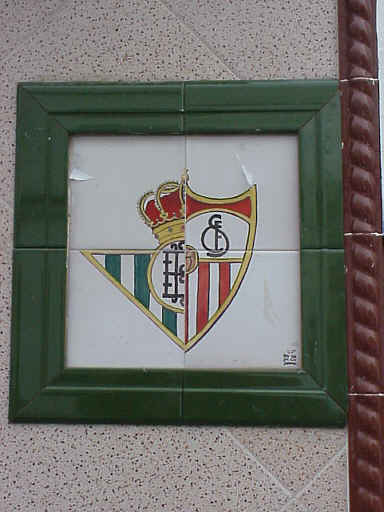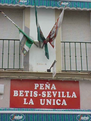 14 de Diciembre de 2004 En plena semana de derbi, ante un encuentro que es tema monetemático en bares y barberias, donde se desatará la guasa de ambos bandos , ( se me viene a la memoria los memorables dialogos radiofónicos del tio y del sobrino , de Pepe da Rosa ) ; les traigo esta imagen insólita .- Curiosamente en mi admirada serie televisiva "Aqui no hay quien viva"( realizada en las inmediciones de Madrid , en esa especie de poligono industrial miniHollywood ) uno de los personajes ,le planteaba a otro ,la posibilidad de su bisexualidad a lo que el otro le respondia : - "Mira dejate de tonterias, o se es del Betis, o se es del Sevilla" Es cierto, en la cacareada dualidad sevillana ,hay pasiones irreconciables, como bien decia el personaje de ficción o se es del Betis o se es del Sevilla; o se es de la Macarena o de la Esperanza de Triana , o se era de Joselito o se era de Belmonte . Pues bien en el sevillano barrio del Cerro del Aguila ; un auténtico micromundo dentro de Sevilla, donde no falta una sola identidad sevillana ; hay una excepción que rompe esta regla.- Concretamente en la calle Aragón , esta esta peña bética sevillista. que se hace llamar con toda propiedad "La Unica" .Como ven en su fachada hondea la bandera de Andalucia, la bandera del Real Betis Balompie y la bnadera del Sevilla FC .- Al lado de la puerta esta este azulejo donde aparece este escudo formado por un extraño hibrido mitad escudo del Sevilla, mitad escudo del Betis . A mas de uno quizas todo esto le resulte extraño ( si les soy sincero a mi me lo resulta ) pero ahi está , como la Puerta de Alcalá. Dentro de la peña hay un bar con asientos con colores verdiblancos y blaquirojos y dos televisores , deduzco que para solventra aquellos casos, frecuentes donde haya simultaneidad de horarios en partido de ambos clubs .- Tras ver esto uno se hace la siguiente reflexión ¿Se imaginan que en una ciudad Sevilla hubiera solo un equipo de futbol?; ¿Que puesto ocupariamos en la tabla ?. Quizas con tanta dualidad y tantas tonterias , asi nos vaya , como nos va en todo los demas . Quizas la iniciativa de esta peña sea todo un ejemplo a seguir .- En cualquier caso quede aqui constancia de la