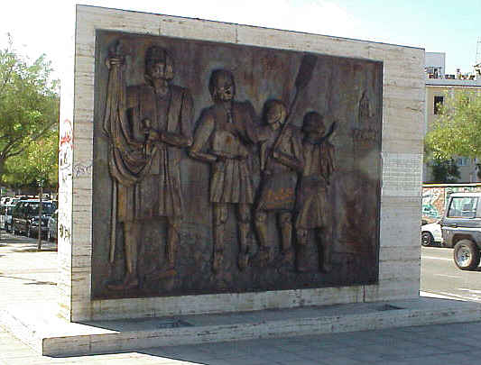 13 de octubre de 2004 Finalizando el recorrido por monumentos colombinos llegamos al acceso de Puente del Patrocinio o del Cachorro, si ese que usted cruza cuando regresa de Matalascaña cada domingo veraniego jarto de coles y según se entra si mira a la derecha alli esta exactamente y con toda seguridad , no solo no ha visto, sino que seguro que no se ha fijado .- Como ven se trata de un altorelieve en bronce adosado a un mural de piedra que esta perfectamente pintarraqueado por el vandalico gamberrimos amen de haber sido ligeramente mutilado .- Es obra de Gabriel Moza y pertenece a ese serie de monumentos de reciente factura con motivo de la Expo del 92., fechado en dicho año El monumento en cuestion , esta titulado "Angeles Trianeros " y como reza en el mismo en una placa de azulejo esta dedicado a marineros trianeros como Rodrigo de Triana , Rodrigo de Batista ,Andres Morales y otros anonimos. Es sorprendente que al llegra al nuevo mundo no fundaran una cofradiera , donde llevaran a los pasos con el izquierdo por delante .- En el relieve tambien aparece el amigo Colon , y al fondo la torre de la Real Parroquia de Santa Ana (?) .-