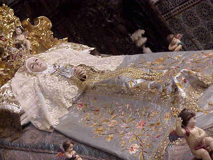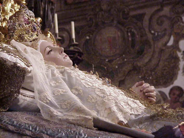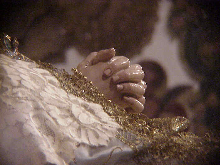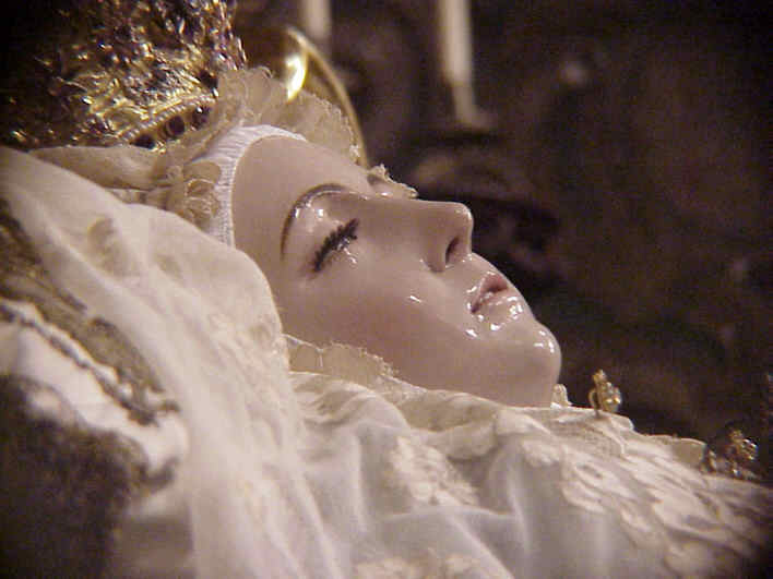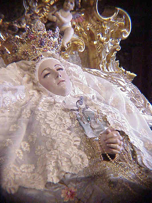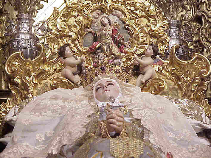 ) de la Virgen en su cama , impecablemente vestida, rodeada de Niños
