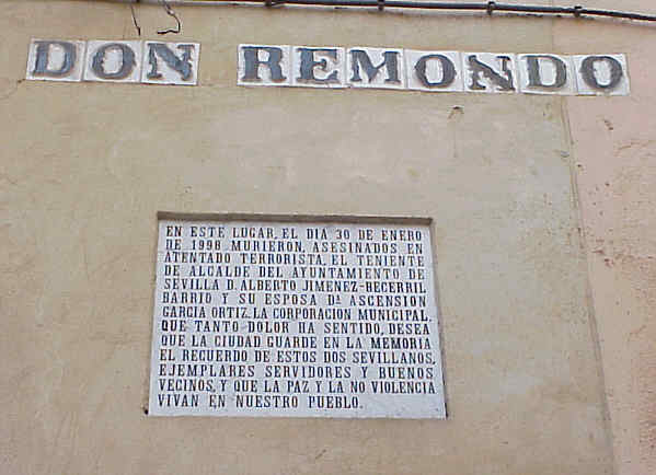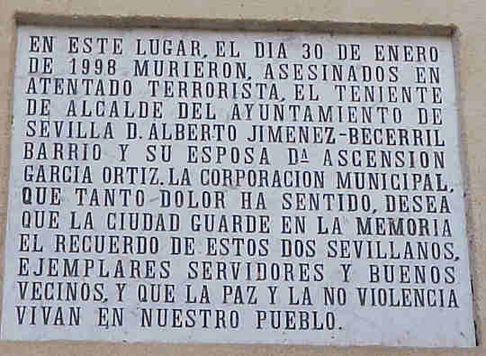 30 de Enero de 2005 Estimado señor Ibarreche, mire este es el plan de Alberto y Asen , ¿ que le parece ? .El tiempo se paró para ellos una fria noche en que unos perros etarras, pues su tierra hay muchas mujeres que paren perros como los que heroicamente atacaron por la espalda a un matrimonio que paseaba por una calle , violentado con ello la soberania vasca .- Porque señor Ibarreche, el plan de los hijos de Alberto y Asen, es peor que el plan de los familiares del hijo de puta que mato a estas dos personas que nunca hicieron daño a nadie , ellos no pueden pedir que a sus padres los aproximen a sus tierra, ellos sencillamente no los podran ver nunca mas .- Porque, es que vera usted señor Ibarreche, quizas su plan no contempla que toda España, esta llena de lapidas como estas, de calles donde si vinieran los de CSI Miami, con el algondon, al pasarelo por el asfalto aun saldria la sangre derramada por tanto inocentes, en nombre de sabra el Diablo, porque, puesto que Dios es imposible que lo sepa .- Quizás en su plan señor Ibarreche, no se contempla como en su dia los alemanes hicieron con los judios, indemnizar a las viudas, a los huerfanos a los padres, de tantos hombres, mujeres y niños, que esa basura etarra que se genera en su tierra y que han exportado fuera de ella .- Alberto y Asen, señor Ibarreche han escrito este plan en forma de lapida , pues las lapidas las escriben los muertos, lo vivos escribe sus planes en ordenadores , con la certeza de que a ellos un dia los perros de su tierra, no los moderan por su espalda , ni sus hijos los volveran a ver mas .- Tambien tenemos el parodógico plan de que los que han hecho esto, y los que mataron a Muñoz Cariñano, cualquier dia se podran cruzar por la calle con los hijos de los asesinados; fruto de una legislacion cobarde y unos gobiernos acomplejados, pues aqui señor Ibarreche el plan del terrorismo se paga barato , tan barato que no se sale ni a un año por muerto .- Señor Ibarreche ,de verdad, venga a la calle Don Remondo y pongase frente a esta pared y lea el plan de Alberto y Asen , haga el esfuerzo mental de imaginarse lo que ocurrio aquella noche hace siete año, como en el nombre de que estupido ideario , se pueden disparar a un hombre de bien por la espalda y a una mujer de cara angelical como Asen ; imaginese señor Ibarreche a esos abuelos y a esos niños al dia siguiente y despues vayase a su minuscula tierra, que pretenciosamente usted llama "pais", y nos cuenta el cuento del alfajor de su plan .- Por favor ,señor Ibarreche la memoria de los muertos y el drama de los vivos, merecen un respecto, y hay muchos españoles que gracias a sus paisanos han escrito su plan con sangre y con vida, para que usted hable de ridiculas tortas .- Este fin de semana celebramos el sesenta aniversario de la liberación de Auschwitz, ¿ me puede usted explicar señor Ibarreche que diferencia hay ? , el primero fue asesinato de "eta", fue el 27 de junio de 1960 de la niña de 22 meses Begoña Urroz Ibarrola, con una bomba en San Sebastián, hoy hace 45 años y 817 muertos , incluidos los dos de esta lápida . y despues de esta lapida le han seguido cuarenta y siete muertos mas .- Señor Ibarreche en serio venga a Sevilla, lea esta lápida y despues vaya en busca de los hijos de Alberto y Asen y de Muñoz cariaños y les explica usted si pestañear con sus carcateristicas cejas arqueadas, eso de su plan, pues como decia al principio mire el plan que desde hace siete año les queda a Alberto y Asen .- Aqui ni perdonamos , ni olvidamos , y lo grabamos