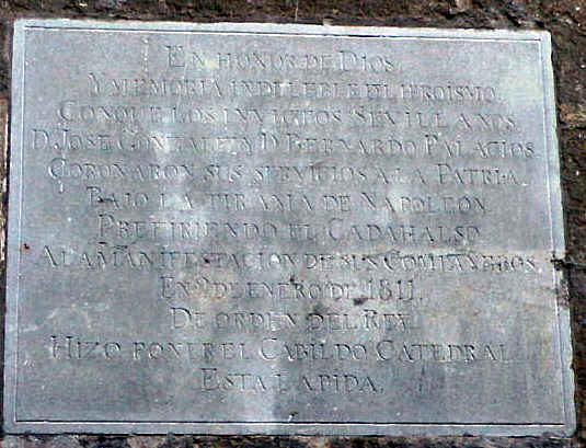 Esta lápida que aqui ven ( no es que la foto sea mala, como argumenta mis detractores a los que tanto quiero y les debo, es que la lapida esta asi de bien conservada ) , esta situada al fondo del Patio de los Naranjos de la Catedral de Sevilla , en una fachada trasera del Sagrario y no se molesten en buscarla porque , alli NO LA VAN A VER , pues esta tras una mampara bajo llave donde guardan la logística de materiales de construcción , aquello mas que un lugar Patrimonio de la Humanidad parece un polvero ( aclaracion importantante dice lugar donde se expende, ladrillos, arenas y diversos articulos de albañileria ).- La lápida esta alli ,pues en el Patio de los Naranjos estan enteradolos ( suponemos que seguiran alli , pues igual estos dos señores han ido a dar con sus huesos al mismo sitios que los cientos de cadaveres que hemos violentado en sus descanso eterno del Salvador , para montar alli un mini Parque Tematico Arqueológico ) pues alli era donde enteraban a los ajusticiados , pues a estos dos olvidados señores ( a estos dos , en Estados Unidos le hacen una pelicula protagonizada por Bratt Pit y Leonardo di Caprio ) les aplicaron el garote vil , en la Plaza de San Francisco .- Pero quizas deberiamos comenzar la historia por el principio D Jose González Cuadrado y Don Bernardo Palacios Malaver ( cuya calle que tiene dedicada en Sevilla solo Dios sabe porque la llaman Palacio "De" Malaver), formaban parte activa de la resitencia ( no solo en Francia hubo resistencia contra la invasion nazi ) contra la invasion napoleonica .- El problema es que los invasores franceses lejos de ser unos vandalos o alanos , curiosamente a pesar de ser vecinos nuestros estaban muchos mas avanzados que nosotros en lo que a urbanismo, obras de equipamiento, tratamiento de obras de arte que nosotros, lo que motivó que un sector de la población invadida , hasta llegaran a verlos con buenos ojos ,esos eran los llamados afrancesado ( no se si a Sevilla, no le vendria mal otra invasion francesa ) frente a los llamados junteros ( gracias a Dios en esa epoca no existia la Junta de Andalucia , pues entonces a los franceses no los hubiera echado nadie ) que se oponian al galo invasor .- El caso es que nuestros dos heroes formaban parte activa de una macro conspiración contra los franceses y tras unas elaboradas investigaciones del ejercito franceses y la policia española afrancesada, lograron dar con ellos , deternerlos , juzgarlos y condenarlos a muerte . la heroicidad estuvo, es que en todo momento la obcesion del extranjero invasor era que estos dos detenidos fueran uno chivatos e informaran la larga lista de conspiradores, proponiendole a cambio de dicha informacion el indulto ( como veran esto de la tortura sicologica no es nada nuevo ya se amplicaba en el siglo XIX ) .- El caso, es que tanto el señor Gonzalez