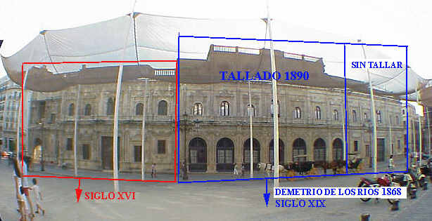 Ayuntamiento de Sevilla siglo XXI año 2005 , observe como desaparece la doble balconada y Demetrio de los Rios en 1868 proyecta la continuidad del edificio y unidad de aspecto con el trozo de edificio del siglo XVI. La doble arcada del cuerpo central desaparece y es sustituida por una nueva fachada donde recien construida se talla la misma encargandosele esta labor al profesor de la Escuela de Bellas Artes D. Pedro Dominguez , comenzando las obras en febrero de 1890 . Se han realizado mas tallas sobre la fachada en 1920 y 1980 .-