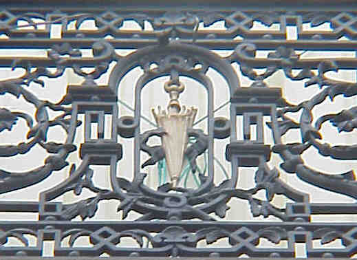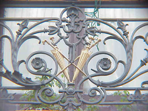 Pero si continuamos nuestro recorrido visual por la fachada nos encontramos con la siguiente balconada , donde la decoración ha variado a un paraguas solitario que recuerda por su empujadora, a uno propio de monterias y el dibujo del hierro ha cambiado .- Efectivamente Casa Rubio desgraciadamente a cerrado sus puertas y si logran salvarse estos balcones , con el paso del tiempo puede que alguien se vuelve a preguntra que hacen alli estos símbolos que le hablaran de la historia de la familia Rubio, de una fabrica de paraguas .- Pero sobre todo de unos abanicos al estilo sevillano de lo mas ligeroas en papel , con varillas de madera o bambú , pintados a plumilla o acuarelas por unos jovenes pintores que se llamaron Hohemleiter, Bacarisa, Martinez de Leon o Romero Escasenas y que en sus mostradores probaron el frescor que desprendia en sus abaniqueos, reinas españolas y europeas, tonadilleras y folkloricas y artitas de Hollywwod. Eran de esos sitios de parada obligada y regalo obligado .- Por lo menos nos quedanran estos balcones y en